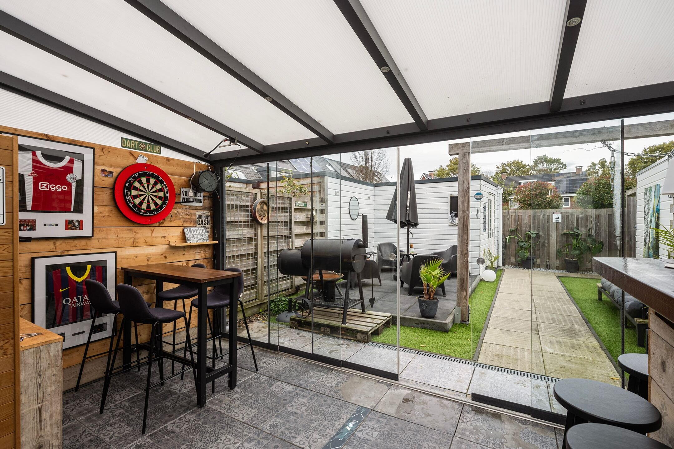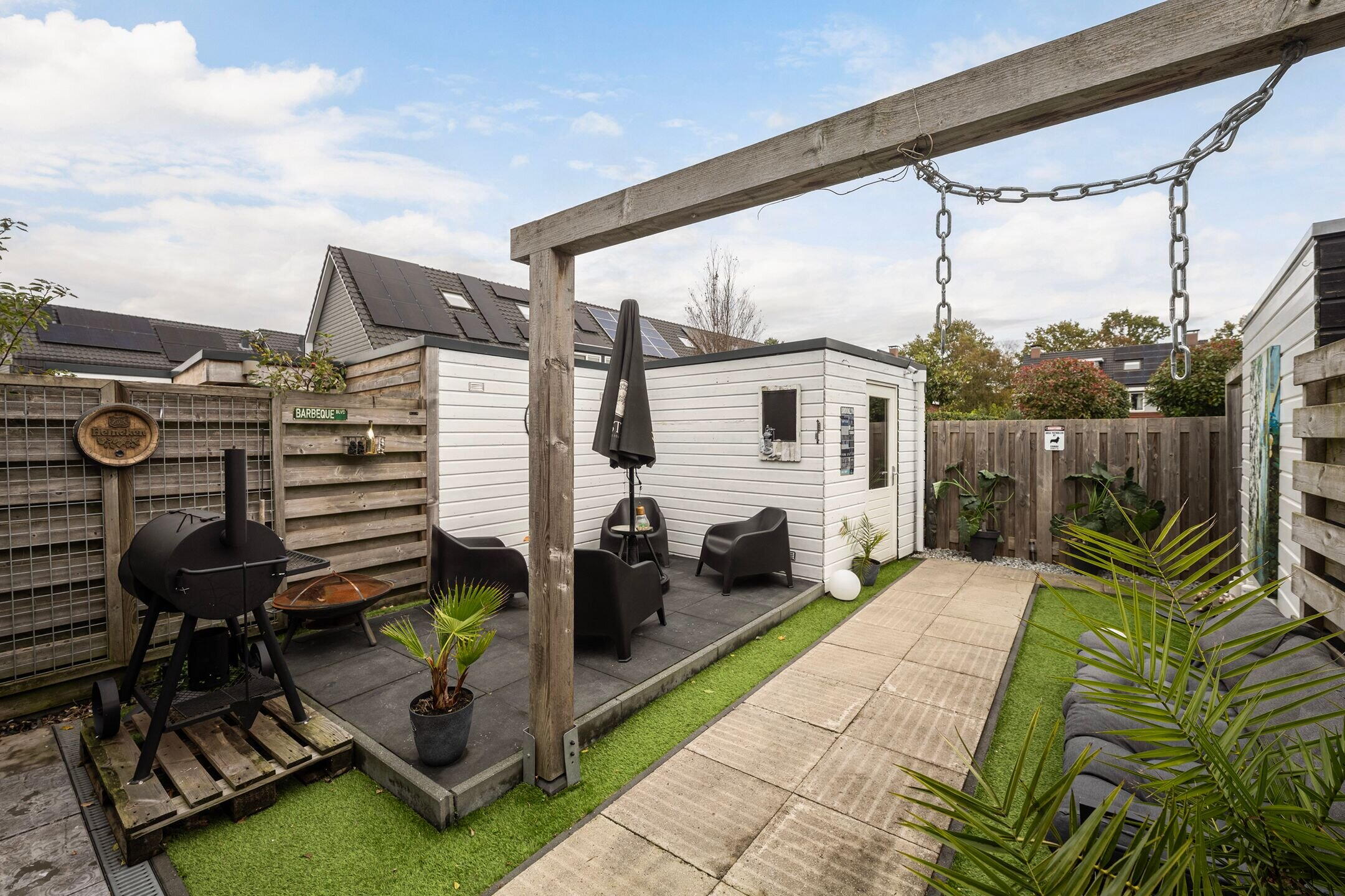 De onderhoudsvriendelijke achtertuin ligt beschut en beschikt over een zonnig terras, achterom en een vrijstaande houten berging met nieuw dak (2024). Ook de woonkameruitbouw kreeg in 2024 een nieuw dak. De voortuin vormt een prettige buffer tussen woning en straat en zorgt voor extra privacy.